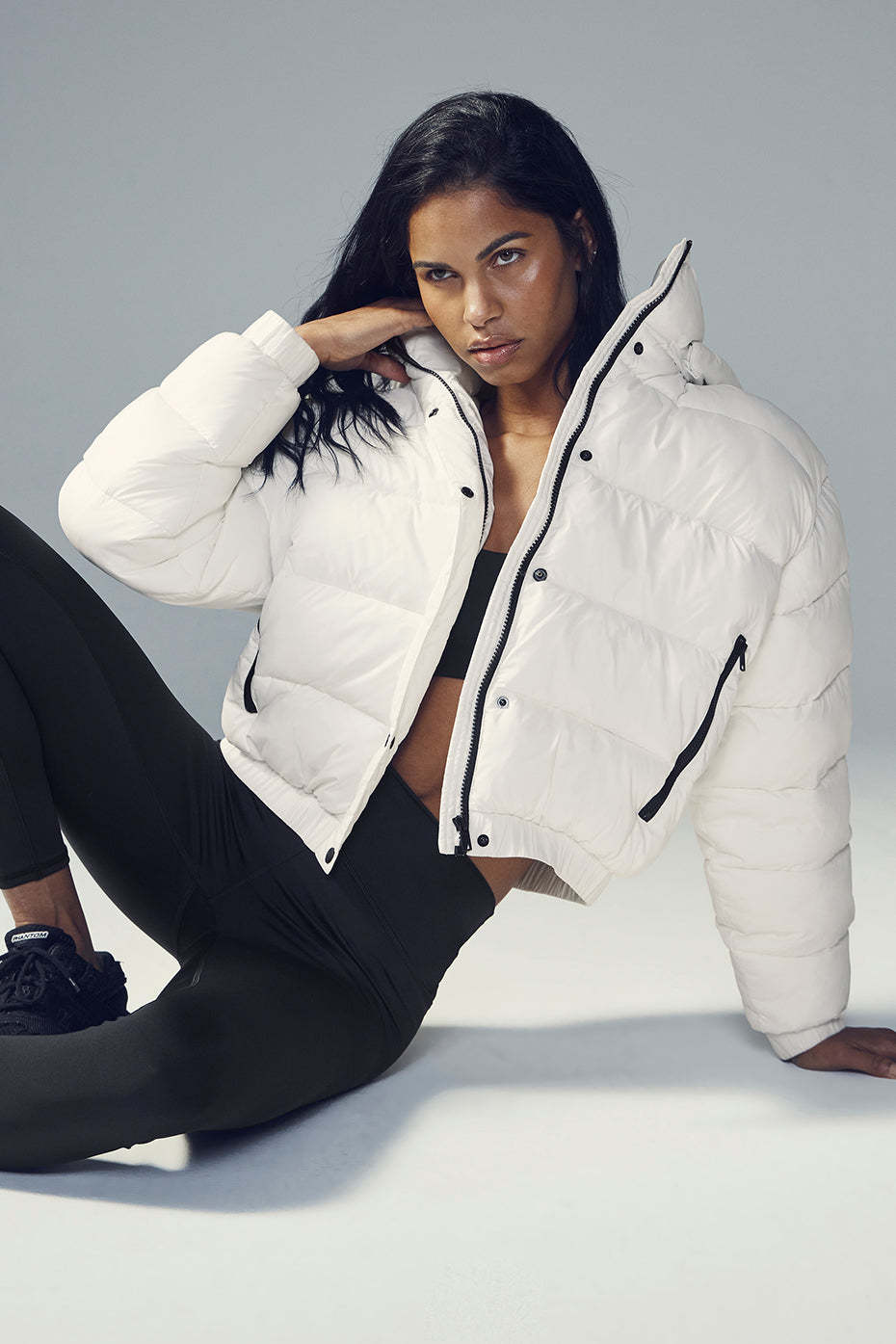 - Regular length puffer jacket hits at the hip
